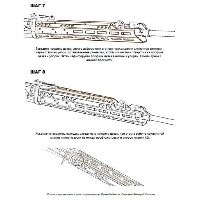 Цевье крепится на посадочное устройство, которое фиксируется на оружии за патронник, чем обеспечивается вывешенность цевья.